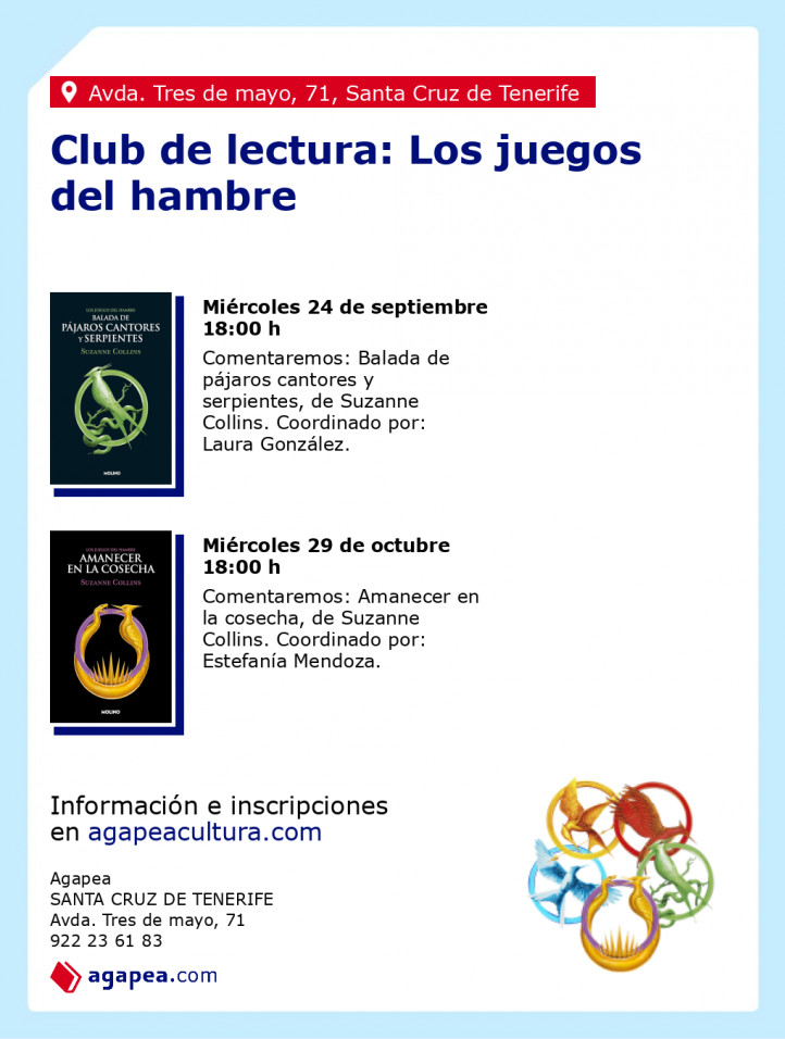 - Miércoles 24 de septiembre. Comentaremos: Balada de pájaros cantores y serpientes, de Suzanne Collins. Coordinado por Laura González.