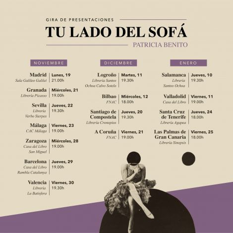 La escritora Patricia Benito aterriza en Canarias de la mano de Agapea Tenerife, donde nos acompañará este jueves 24 de enero a partir de las 18:00 horas. Para acercarnos a sus obras; "Primero de Poeta" y "Tu lado del sofá"; dentro de su gira, que comparte nombre con esta nueva publicación.