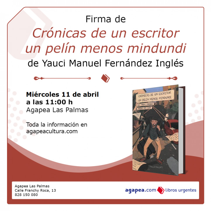 Firma de Crónicas de un escritor un pelín menos mindundi, de Yauci Manuel Fernández Inglés. Este diciembre en Agapea Las Palmas