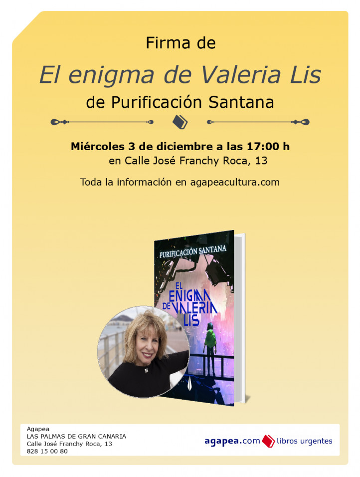 Firma de El enigma de Valeria Lis, de Purificación Santana. En Agapea de Las Palmas de Gran Canaria