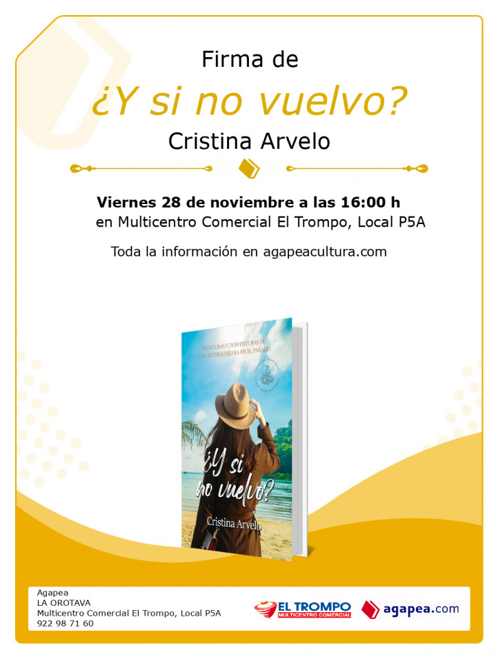 Firma de ¿Y si no vuelvo? de Cristina Arvelo. En Agapea La Orotava.